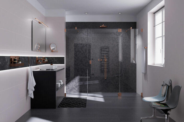 XL-Dusche mit Glaswand, Doppelwaschtischanlage inkl. Möbel, Spiegel, Badheizkörper, Armaturen und Accessoires